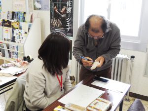 アイヌ文化活動アドバイザーである平田篤史さんの指導のもと,8名の参加者がアイヌの女性用小刀「メノコマキリ」の鞘にアイヌ文様を彫刻しました。
